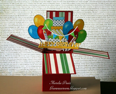 The pop up box is made to fit into an A2 envelop. All the inserts are made with die cuts. The cake, candles and balloons are stamped and then cut with Paper Sweeties. Happy Birthday is an Elizabeth Crafts die cut. The banner is a die that I received in a prize package so I am not sure of the company.